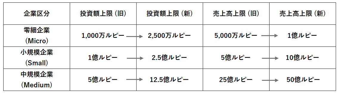上記に加えて、インド政府は支援対象を拡大するために、MSMEの定義基準変更を発表しています。そもそもMSMEの定義は、2006年に制定された中小零細企業開発法(MSME Development Act, 2006)において規定されており、製造業/サービス業ごとに、機械設備や工場への投資額により、中規模企業、小規模企業、零細企業の定義がそれぞれ定められていました。そして、このコロナ禍においてより多くの企業が資金調達の支援を受けられるよう、拡大されたMSMEの定義基準は、2025年のインド連邦予算案において、大幅に見直され、投資額と売上高の上限が引き上げられました。