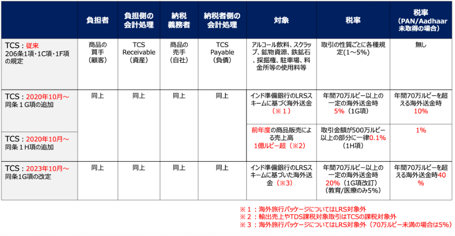 インド所得税法第206C条1G項では、教育ローンや医療・教育目的の送金を除いて、インド準備銀行の送金自由化スキーム(Liberalised Remittance Scheme – LRS)に基づいた年間70万ルピーを超える海外送金に際して、送金元の銀行(Authorised Dealer)に年間70万ルピーを超える送金額に対して20%のTCSを徴収するよう求めています。